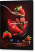 The artwork is a hyper-realistic painting of strawberries in a glass bowl being drizzled with melted chocolate. A spoon is pouring the chocolate over the strawberries, capturing a sense of motion. The strawberries are vibrant red, and the gloss of the chocolate adds a rich texture. Some strawberries are scattered on the surface, alongside a couple of blueberries, enhancing the composition. The dark background contrasts with the bright colors, highlighting the fruit and chocolate.