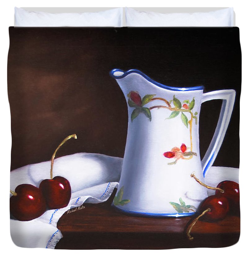 The artwork is a still life painting featuring a white ceramic pitcher with floral and leafy designs. It is placed on a dark wooden surface alongside several ripe cherries. A gracefully placed white linen with a subtle blue trim lies beneath the cherries, adding to the composition. The lighting casts gentle shadows and highlights, creating a sense of depth and realism in the scene.
