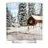 The artwork is a serene winter getaway retreat near Aspen Colorado featuring a rustic log cabin nestled in a snowy landscape. Tall evergreen trees, covered in snow, surround the cabin, and mountains rise in the background. The roof of the cabin is blanketed with snow, and a thin layer of frost clings to its edges. A fence runs along the foreground, partially buried in snow, adding depth to the tranquil, picturesque setting. The overall palette consists of cool whites and blues, with touches of brown from the cabin and fence, emphasizing the chill of a winter day. Come on in and light a fire.