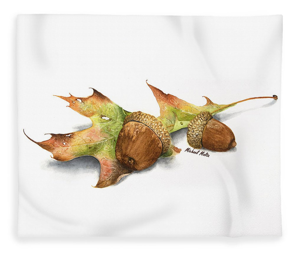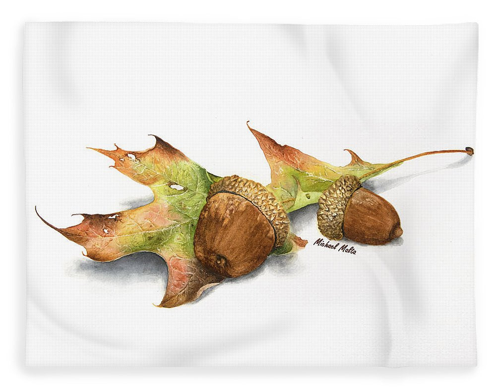 The artwork is a detailed watercolor painting of two acorns resting on a brown and green autumn leaf. The fallen oak leaf changes from greens to yellows and reds and finally browns as the fall season comes to an end. The acorns have textured caps, and the leaf shows varying shades of brown, green, and hints of red, capturing the essence of fall. The intricate detail highlights the natural textures and colors.