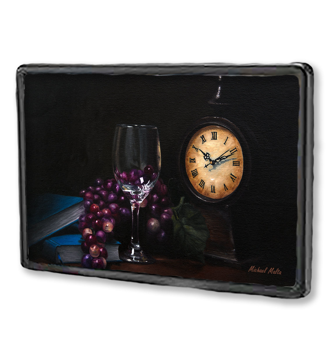 A beautiful still-life oil painting of books, grapes, a clock, and a wine glass with a dark background. As the name implies, Taking Time is meant for you to take the time you need for the things that are important to you. The painting is framed in a dark walnut wood frame enhancing the colors depicted in the painting. This painting would look fantastic hanging in any office or study.