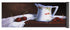 The artwork is a still life painting featuring a white ceramic pitcher with floral and leafy designs. It is placed on a dark wooden surface alongside several ripe cherries. A gracefully placed white linen with a subtle blue trim lies beneath the cherries, adding to the composition. The lighting casts gentle shadows and highlights, creating a sense of depth and realism in the scene.