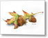 The artwork is a detailed watercolor painting of two acorns resting on a brown and green autumn leaf. The fallen oak leaf changes from greens to yellows and reds and finally browns as the fall season comes to an end. The acorns have textured caps, and the leaf shows varying shades of brown, green, and hints of red, capturing the essence of fall. The intricate detail highlights the natural textures and colors.