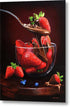 The artwork is a hyper-realistic painting of strawberries in a glass bowl being drizzled with melted chocolate. A spoon is pouring the chocolate over the strawberries, capturing a sense of motion. The strawberries are vibrant red, and the gloss of the chocolate adds a rich texture. Some strawberries are scattered on the surface, alongside a couple of blueberries, enhancing the composition. The dark background contrasts with the bright colors, highlighting the fruit and chocolate.