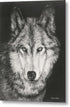 A stunning portrait drawing in charcoal of a North American gray wolf keeping watch in the dark of night. Wolves roam over large territories and are built for distance running. The coat or fur of a gray wolf can be many shades of gray, tan, brown, rusty red, cream, solid black, and white. Wolves have large teeth, and jaws with a bite force of 1,500 pounds per square inch, capable of crushing the thighbone of a moose.