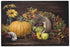 The artwork is a still life painting depicting a rustic autumn scene. It includes a prominently featured bright orange pumpkin resting on a wooden surface. Surrounding the pumpkin are various autumn elements, such as an overturned basket spilling gourds, apples, and vibrant fall leaves. Sunflowers and other seasonal flowers add color and texture, enhancing the warm, earthy tones that dominate the piece. The overall composition exudes a sense of harvest and thanksgiving.
