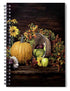 The artwork is a still life painting depicting a rustic autumn scene. It includes a prominently featured bright orange pumpkin resting on a wooden surface. Surrounding the pumpkin are various autumn elements, such as an overturned basket spilling gourds, apples, and vibrant fall leaves. Sunflowers and other seasonal flowers add color and texture, enhancing the warm, earthy tones that dominate the piece. The overall composition exudes a sense of harvest and thanksgiving.