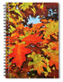 This artwork is a richly colored painting featuring a multitude of autumn leaves. The leaves are depicted in vibrant hues of orange, yellow, and red, showcasing a brilliant display of fall foliage. They are layered closely together, creating an intricate pattern with varied shapes and sizes. The background has patches of blue sky peeking through the dense cluster of leaves, adding depth and contrast to the composition. How can Mother Nature create something so joyful.