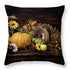 The artwork is a still life painting depicting a rustic autumn scene. It includes a prominently featured bright orange pumpkin resting on a wooden surface. Surrounding the pumpkin are various autumn elements, such as an overturned basket spilling gourds, apples, and vibrant fall leaves. Sunflowers and other seasonal flowers add color and texture, enhancing the warm, earthy tones that dominate the piece. The overall composition exudes a sense of harvest and thanksgiving.