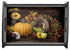The artwork is a still life painting depicting a rustic autumn scene. It includes a prominently featured bright orange pumpkin resting on a wooden surface. Surrounding the pumpkin are various autumn elements, such as an overturned basket spilling gourds, apples, and vibrant fall leaves. Sunflowers and other seasonal flowers add color and texture, enhancing the warm, earthy tones that dominate the piece. The overall composition exudes a sense of harvest and thanksgiving.