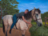 The artwork is a realistic painting depicting Audrey lying on the back of Bling. Audrey is wearing a dark green shirt and blue jeans, embracing the horse gently. Bling is light-colored with a dark mane and is outfitted with a bridle. The background shows a sunny landscape with a path, trees, and a wooden fence. The painting captures a moment of connection between Audrey and Bling, rendered with attention to detail and naturalistic tones.