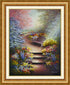 The artwork is a serene landscape painting showcasing a meandering path through a vibrant, blossoming garden. A wooden bench is placed beside the path, inviting viewers to imagine resting there. The garden is lush with a variety of colorful flowers and foliage, creating a rich tapestry of reds, yellows, blues, and greens with intoxicating fragrances. The background is softly lit, suggesting the gentle light of dawn or dusk filtering through the trees, with distant birds adding to the peaceful atmosphere. The composition exudes tranquility and natural beauty.