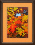 This artwork is a richly colored painting featuring a multitude of autumn leaves. The leaves are depicted in vibrant hues of orange, yellow, and red, showcasing a brilliant display of fall foliage. They are layered closely together, creating an intricate pattern with varied shapes and sizes. The background has patches of blue sky peeking through the dense cluster of leaves, adding depth and contrast to the composition. How can Mother Nature create something so joyful.