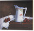 The artwork is a still life painting featuring a white ceramic pitcher with floral and leafy designs. It is placed on a dark wooden surface alongside several ripe cherries. A gracefully placed white linen with a subtle blue trim lies beneath the cherries, adding to the composition. The lighting casts gentle shadows and highlights, creating a sense of depth and realism in the scene.